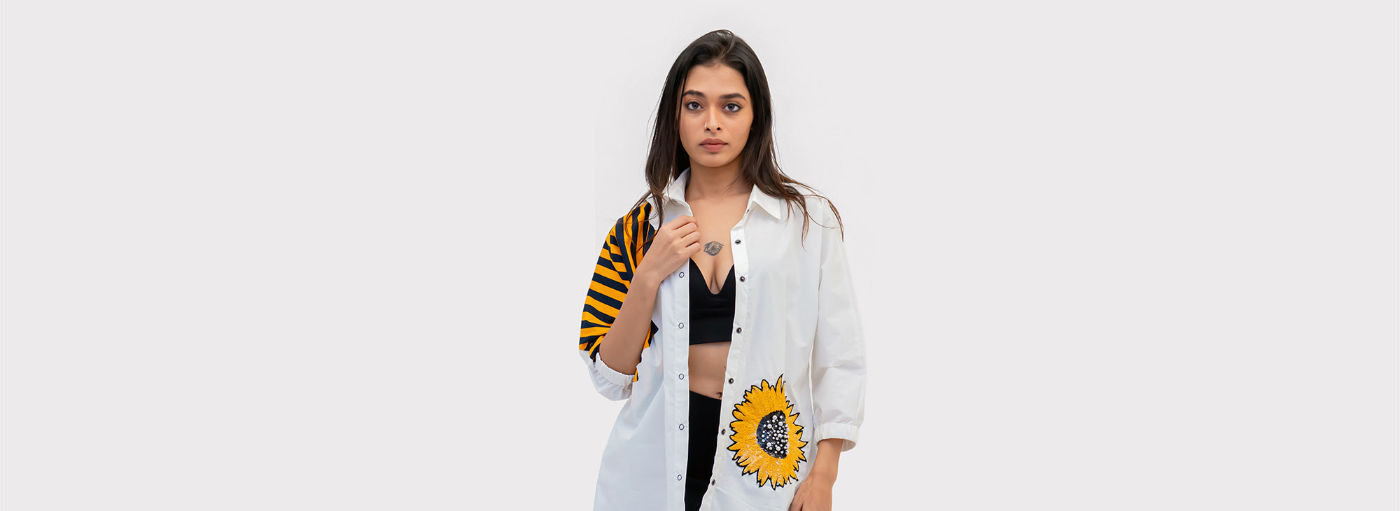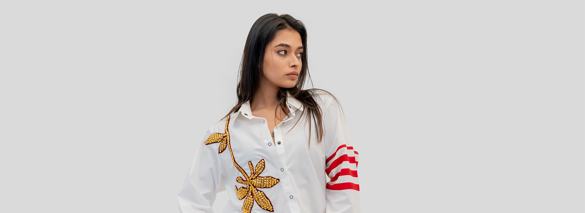 White Cotton Shirt with Contrast Sleeves and Embroidery